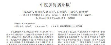 [1] 蔡春江.中医脾胃病杂谈[J].中国中医基础医学杂志,2011