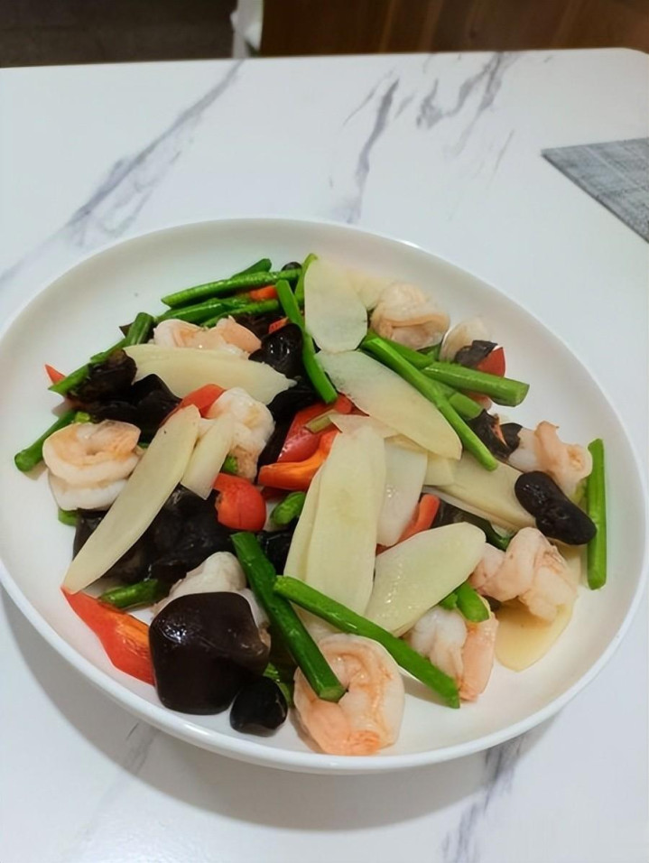 7. 放入炒过的虾仁,加入2克盐和5毫升生抽,翻炒均匀后即可出锅。