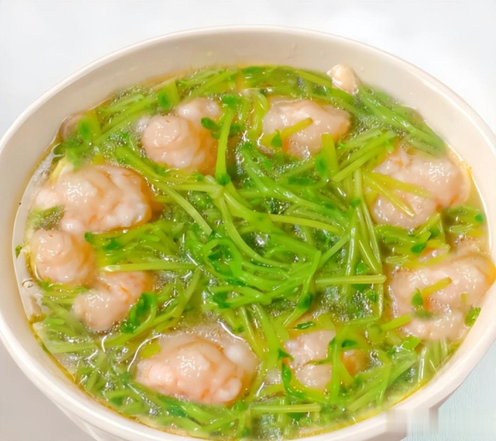 豆苗200克、虾滑150克、生姜1块、盐2克、白胡椒粉少许、香油几滴、清水适量。