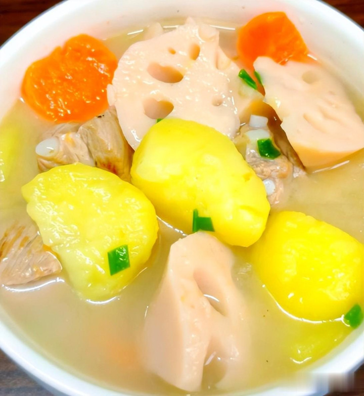 6. 放入莲藕块和土豆块,继续炖煮20 - 30分钟,直到莲藕和土豆软烂。
