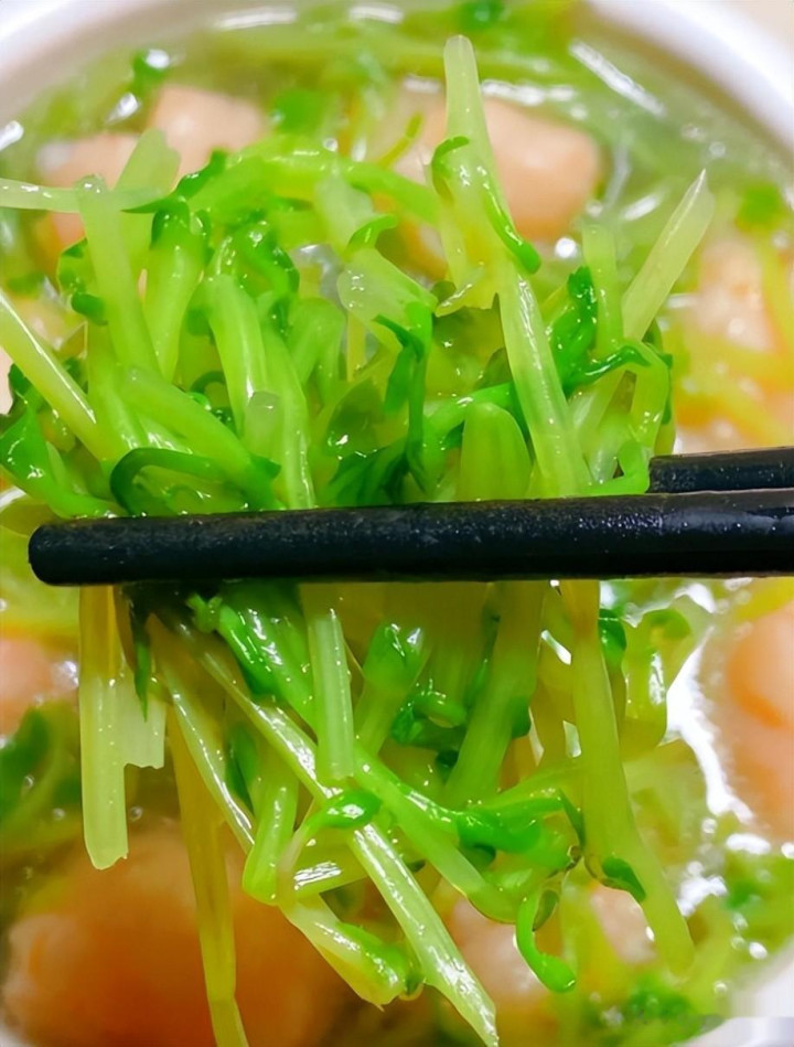 (2) 豆苗很嫩,煮的时间要短,保持脆嫩口感。