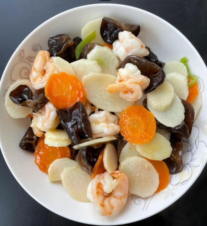木耳50克、山药1根、虾仁150克、胡萝卜半根、大蒜2瓣、盐2克、料酒5毫升、生抽5毫升、淀粉3克、食用油适量。