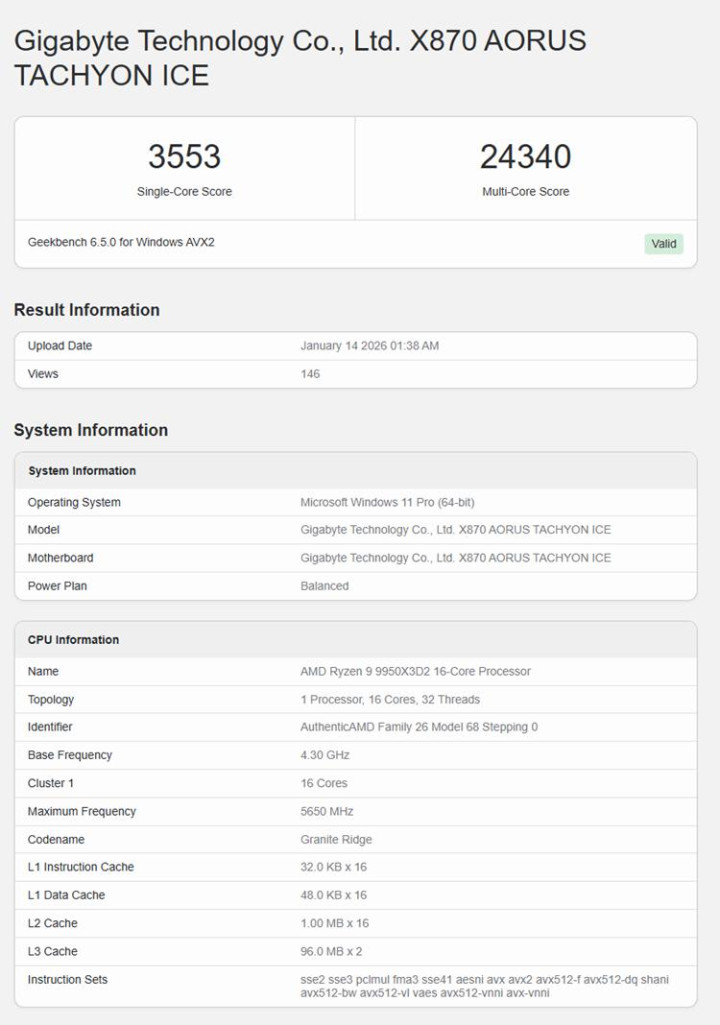目前似乎所有的未正式发布的处理器都会在GeekBench上跑一圈,或许是因为这款软件可以上传成绩至数据库,当然对于锐龙9 9950X3D2来说也同样如此,在GeekBench 6数据库中就出现了锐龙9 9950X3D2的跑分数据。根据GB6的数据,锐龙9 9950X3D2的单核分数为3553分,开云官方体育app官网而多核分数为24340分,这个分数与锐龙9 9950X3D相比大约提升了7%。根据锐龙7 9850X3D处理器的跑分成绩,大概率这波红利属于频率,也就是说锐龙9 9950X3D2在频率上比上一代处理器更加出色。
