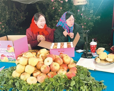 辽宁省大连市金州区干部(右)带领团队直播销售三十里堡苹果。王小妮摄