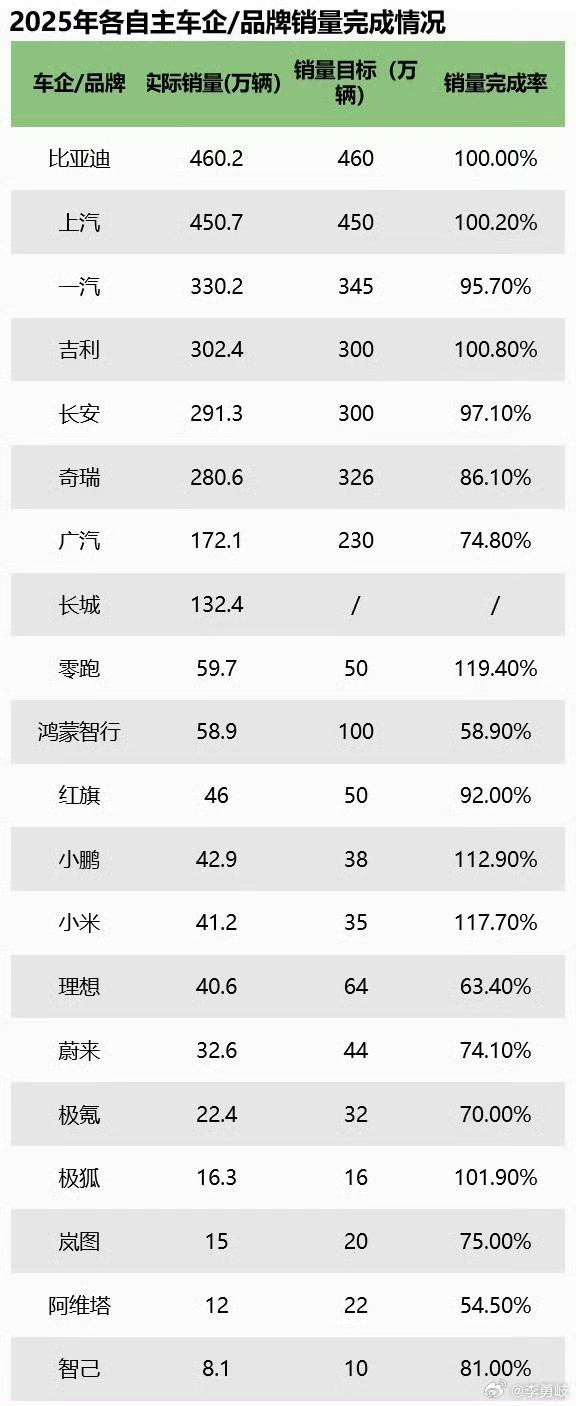 对比比亚迪、上汽、吉利、零跑、小鹏、小米、极狐这几个品牌完成率100%并且部分超额,谁在裸泳一目了然。