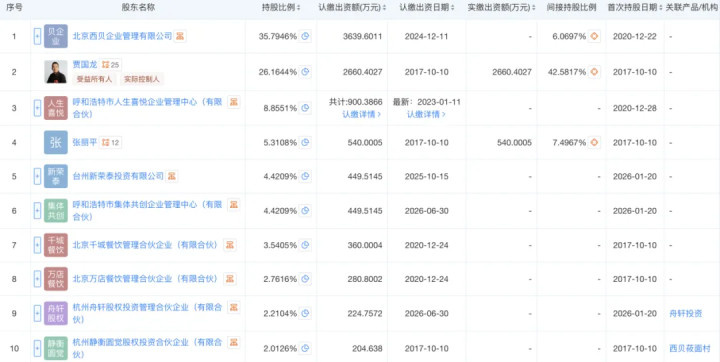 据天眼查App显示,西贝最大的股东仍是北京西贝企业管理有限公司,持股比例为35.79%;贾国龙个人持股26.16%,呼和浩特市人生喜悦企业管理中心持股8.86%,贾国龙的妻子张丽平个人持股5.31%。