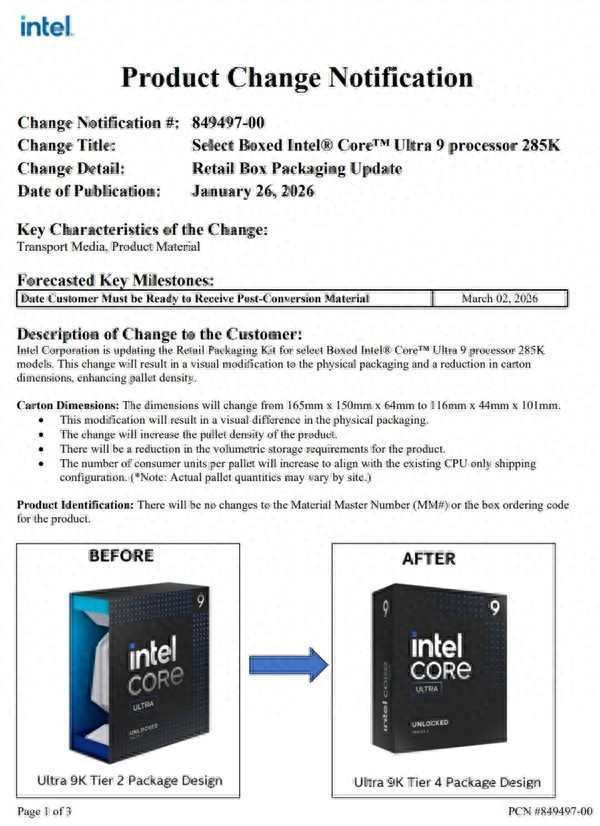 快科技1月28日消息,近日,Intel发布了一份产品变更通知(PCN),确认其旗舰台式机处理器酷睿Ultra 9 285K将迎来零售包装的更新,原有的“Ultra 9K Tier 2”大尺寸包装将被更为紧凑的“Ultra 9K Tier 4”方案取代。