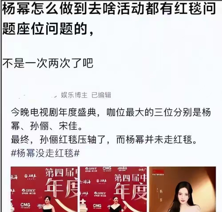 随后,还给杨幂的团队清楚了,但谁又信呢?毕竟,杨幂抢C位可不是就这一次。有一次电视剧盛典,杨幂得知孙俪要压轴走红毯,她就径直不走红毯了。归正一句话,有她在,C位必须是她的!