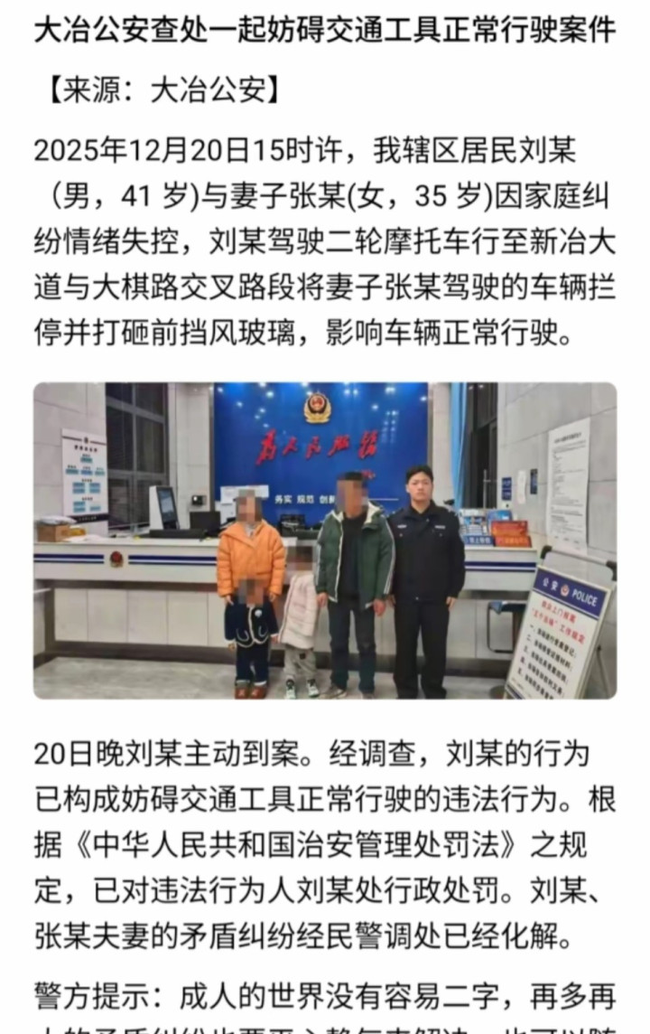 这事儿一开始传出来,大家都说是路怒症——男的骑电动车带着娃,被小车溅了一身水,当场发飙砸车。视频一出来,网上骂声一片,都说这男的太狠,不管孩子安危。可后来大冶公安局发了通报,事情全变了味。原来那车上开车的女司机,根本不是陌生人,是这男人刘某的妻子。两人是夫妻,还有一儿一女,那天闹矛盾,女的开车要走,刘某骑车追上去拦车,火气一上来,直接动手。