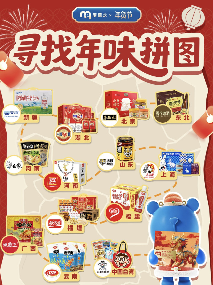同时,为深化本次“全国寻鲜”的主题,麦德龙不仅引入全国特色食材,更与六必居、盼盼、大白兔等各地承载国民记忆的知名传统品牌深度合作,发起“寻找年味拼图”活动,以联合礼包派送的形式,将各地品牌年味齐聚一堂,让置办年货融入年轻客群的焕新年味记忆。