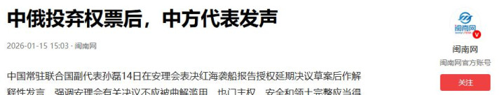 1月14日,安理会屏幕上显示,第2812号决议由13个国家赞成,中俄2国弃权通过。表面是“技术延长”,即把红海商船袭击的月度报告机制延续到2026年7月15日,继续进行监测并产出报告。